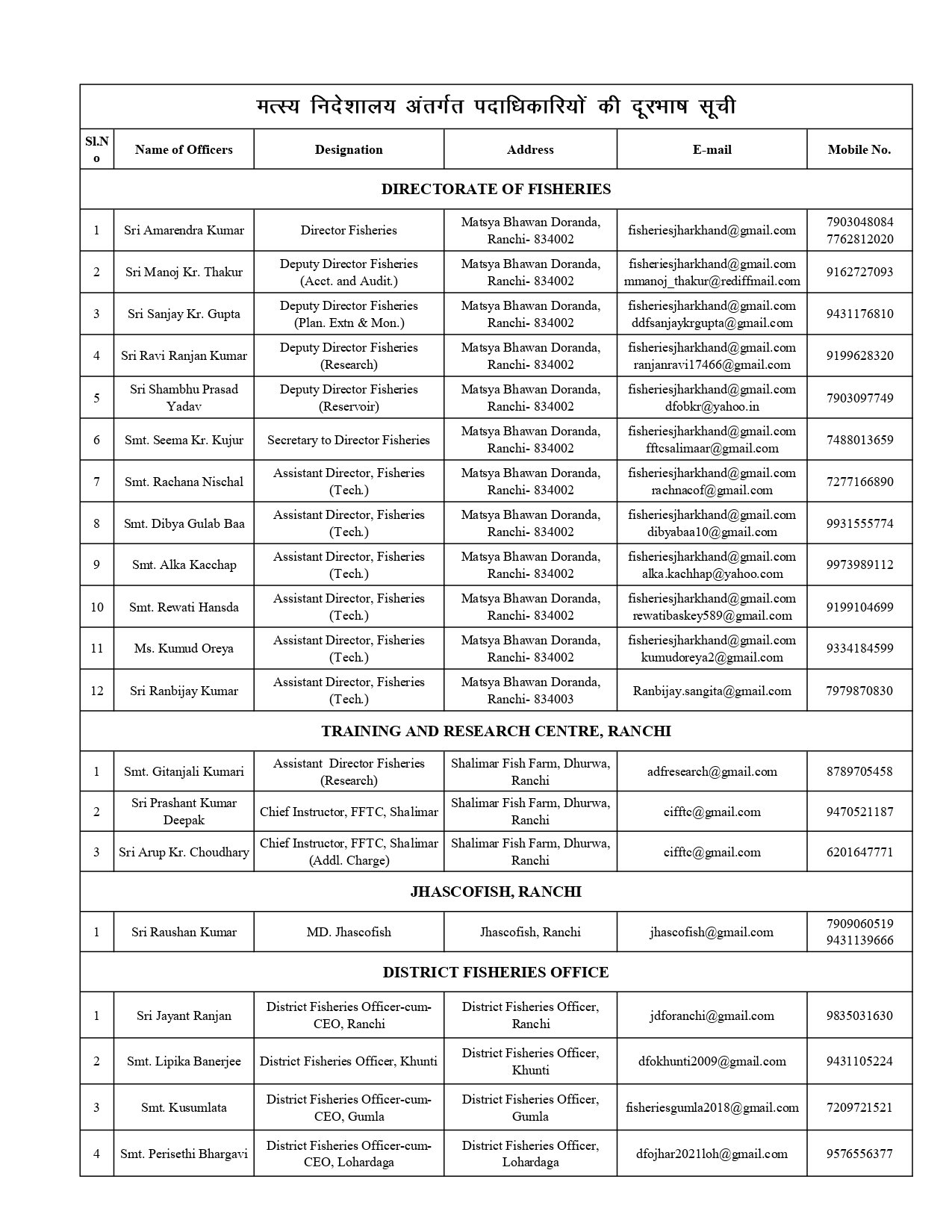 The Directorate of Fisheries is under the Department of Agriculture, Animal Husbandry and Cooperatives Govt. of Jharkhand. It is headed by the Director Fisheries and it has 24 offices of the District Fisheries Officer in all the districts of the state. The state level offices are Fish Farmers Training Centre and Fisheries Research Centre both at Ranchi.